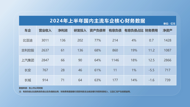 而上市车企在有息负债上的占比并不高,今年上半年吉利、上汽的有息负债占比分别为19%、18%,而比亚迪、长安则只有4%、1%。