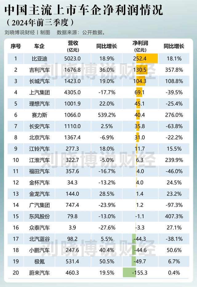 头部车企如比亚迪盈利强劲且稳定,新能源车企如理想、赛力斯表现突出,传统头部国有车企则陷入困境。