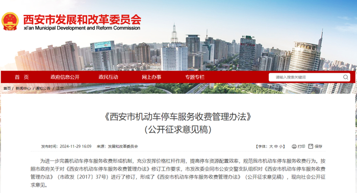 据西安市发展和改革委员会消息,西安市发改委同西安市公安交警支队组织对《西安市机动车停车服务收费管理办法》进行了修订,形成了《西安市机动车停车服务收费管理办法》(公开征求意见稿)。11月29日至12月28日前向社会公开征求意见。