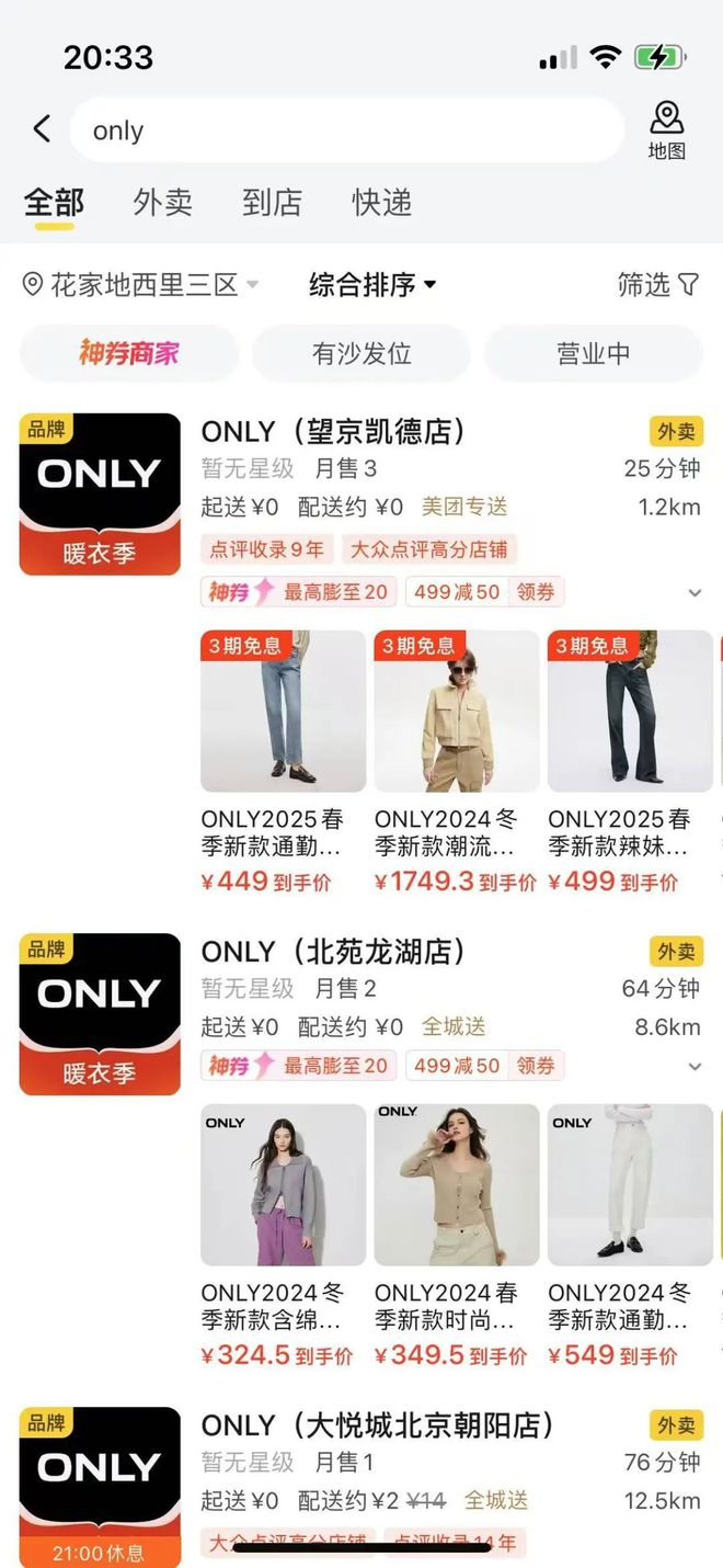 除了以上美团高调官宣的合作品牌,在美团平台内,笔者发现 ONLY、jackjones 等相关服饰品牌目前已入驻美团。此外在美团搜空调、电视、冰箱、洗衣机等大家电,也可以看到最快可以当天送达、当天安装,但是有报道称,大家电业务目前只在主要一二线城市可实现。