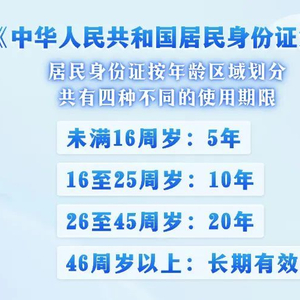 《中华人民共和国居民身份证法》第五条规定,十六周岁以上公民的居民身份证的有效期为十年、二十年、长期。十六周岁至二十五周岁的,发给有效期十年的居民身份证;二十六周岁至四十五周岁的,发给有效期二十年的居民身份证;四十六周岁以上的,发给长期有效的居民身份证。未满十六周岁的公民,自愿申请领取居民身份证的,发给有效期五年的居民身份证。