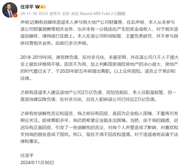 11月30日,经济学家、泽平宏观创始人任泽平在个人微博账号发文称:“近期有自媒体造谣本人参与恒大地产公司财富等,在此声明,本人从未参与该公司财富销售等相关业务,也并未有一分钱由此产生的奖金或收入,对于相关造谣自媒体,律师函已在路上。本人在该公司时间短暂,主要负责研究,并不参与具体经营相关业务。此前已多次声明。”