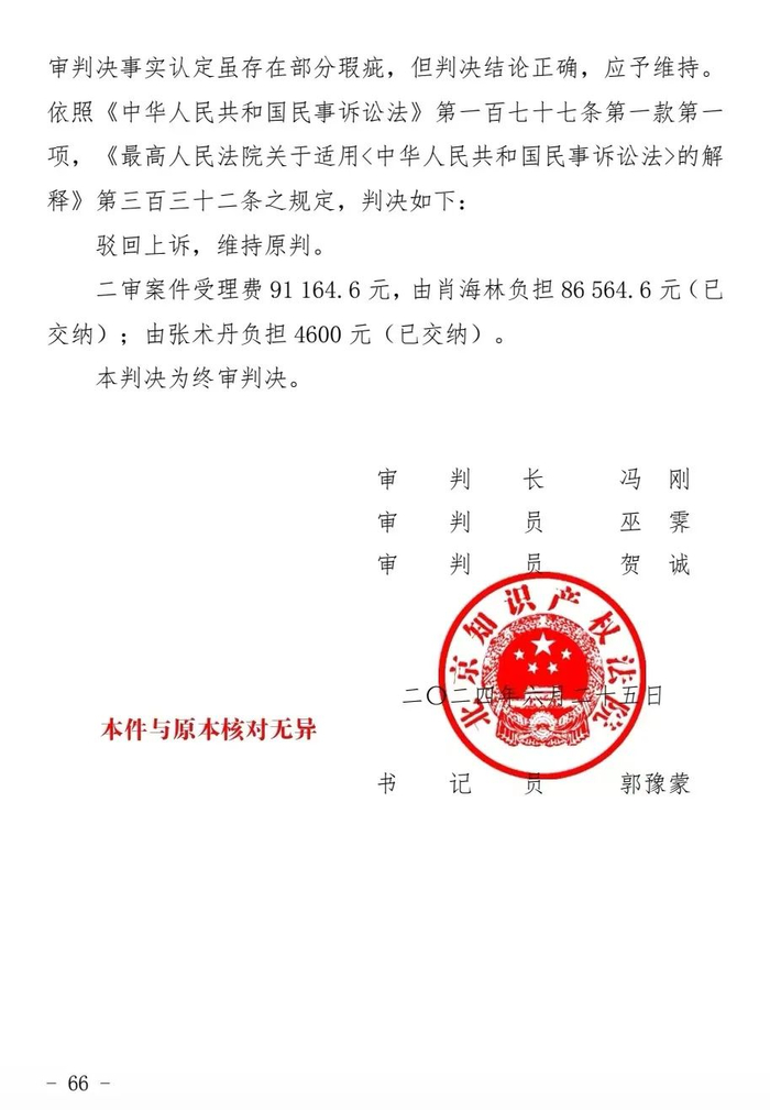 双方上诉后,2024年6月,北京知识产权法院认定涉案论文属于张术丹与肖海林的合作作品,并认为一审的事实认定虽存在部分瑕疵,但判决结论正确,遂维持原判。