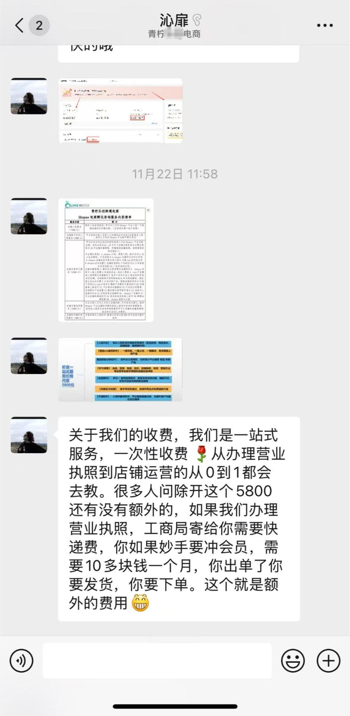 在一位声称可免费提供跨境电商资料的博主推荐下,记者添加青柠电商公司的企业微信工作人员沁扉。对方发来“新手无货源如何在跨境电商市场中赚钱”直播,讲解人员详细推介一家跨境电商平台。沁扉承诺,5800元是一站式服务费,即可享受涵盖店铺开设、选品指导、流量帮扶等一系列一对一服务,帮助实现无货源跨境电商的创业。她强调,后续并不收取任何费用,劝说记者尽快交费。