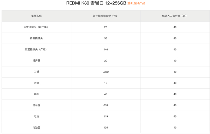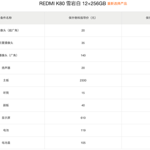 首先是K80标准版,以12+256GB雪岩白配色为例,保外物料指导价具体为:前置35元,后置主摄140元,后置超广角20元,扬声器20元,主板2330元(不同存储版本不同,如16GB+1TB版是2870元),副板40元,屏幕610元,电池119元,电池盖105元,听筒15元。(保外人工指导价40元)