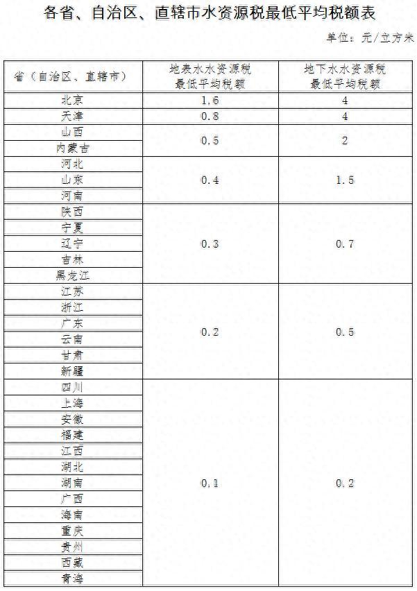 最低的有上海、四川、青海等13个省市,地表水水资源税最低平均税额是0.1元/立方米,地下水是0.2元/立方米。相比北京的税额,低了很多。所以,我也不知道这个水资源税到底是根据什么标准来收的。