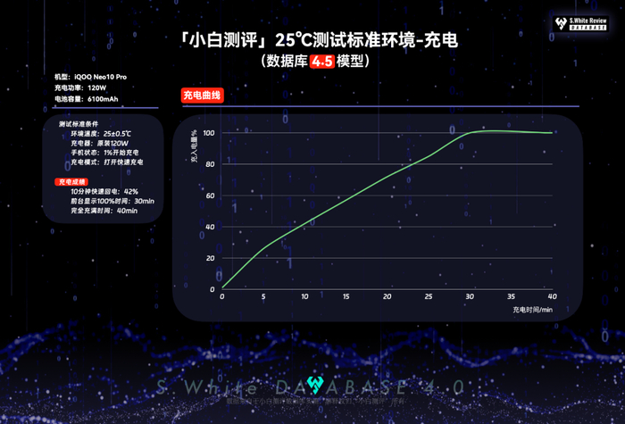 充电方面,iQOO Neo10 Pro配备6100mAh电池容量,120W有线充电,在25℃测试标准环境中使用120W充电器,10分钟快速回电42%,30分钟前台充入100%,40分钟完全充满。