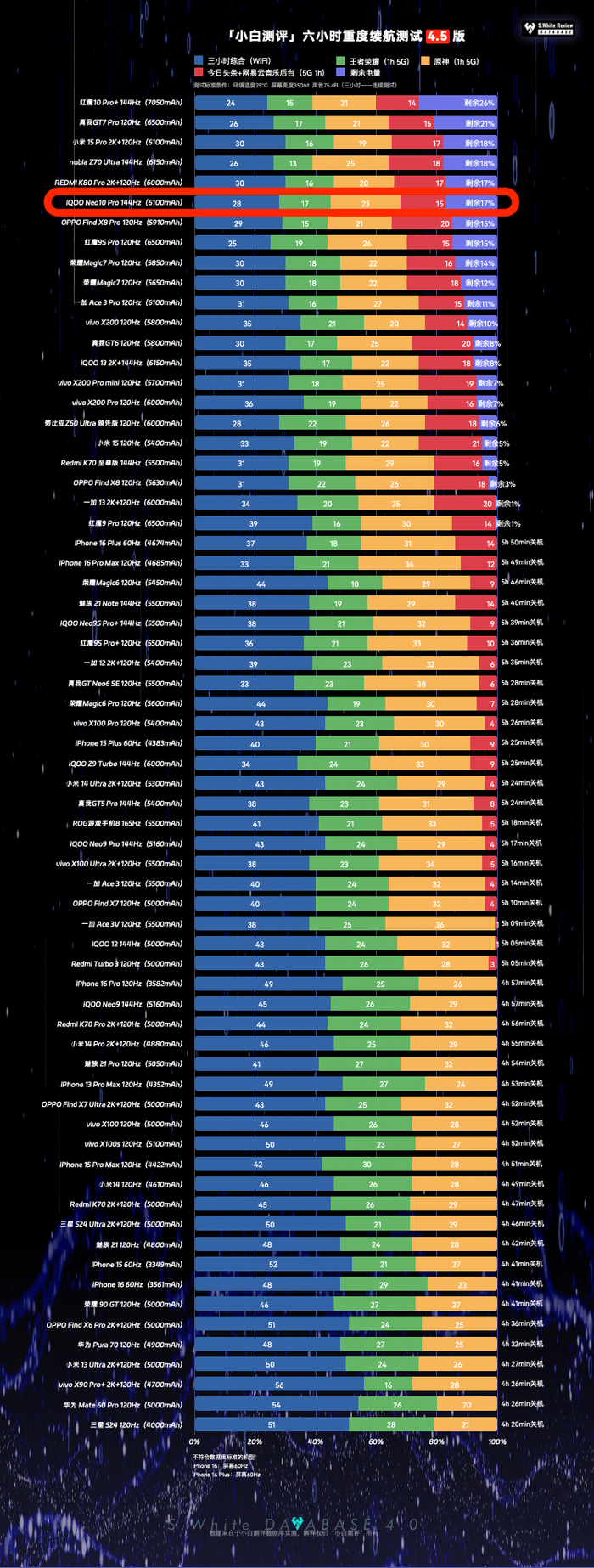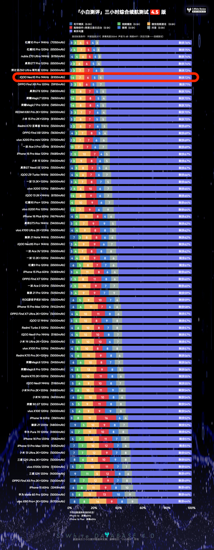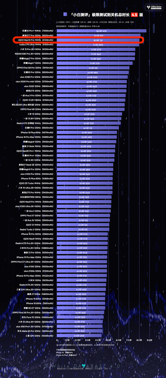 以上基于小白测评数据库4.5测试,环境温25℃±0.5℃,屏幕亮度350nit,声音75dB(六小时、测到关机:性能模式)(系统基于iQOO Neo10 Pro测试时的最新版本PD2426D_A_15.0.9.13.W10.V000L1测试)