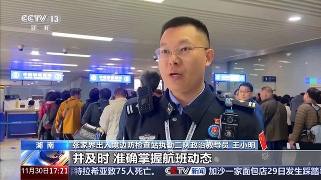 张家界出入境边防检查站执勤二队政治教导员 王小明:免签政策试行期间,我们通过服务前置,加强引导等举措优化通关流程,并及时、准确掌握航班动态及载运旅客情况,科学配置警力,实现持续为出入境旅客提供安全、高效、便捷的通关环境,保障口岸通关平稳有序。