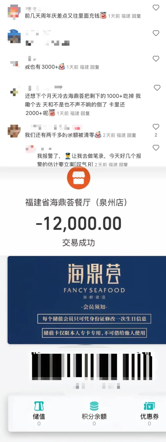 近日,位列高德、大众点评等平台厦门餐饮美食榜的海鼎荟海鲜自助餐厅被曝悄悄闭店,不少充值会员卡内的金额被“清零”,疑似跑路。