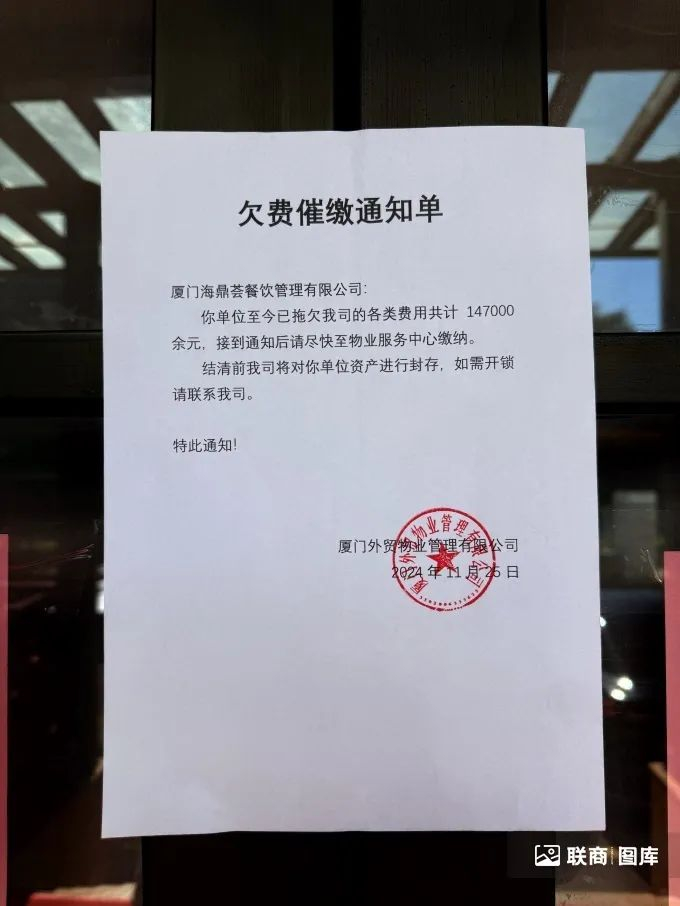 其中“欠费催缴通知单”的落款是厦门外贸物业管理有限公司,上面写着“厦门海鼎荟餐饮管理有限公司拖欠业主方各类费用共计14.7万元,接到通知后尽快至物业服务中心缴纳。”