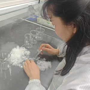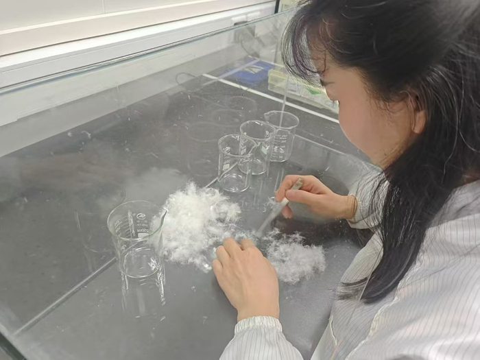 几个量杯、一把小镊子,将送检的羽绒样品平铺在桌面上,已有十多年检测经验、市质检院纤检所工程师闫畅正端坐在透明玻璃罩前,开始“精选”绒子。