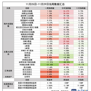 美股方面,道指本周累计涨1.39%,标普500指数全周累涨1.06%,再度创下新高,纳指累涨1.13%。11月,道指涨7.54%,纳指涨6.21%。标普500指数涨5.73%,创下自2023年11月以来最大的单月涨幅。