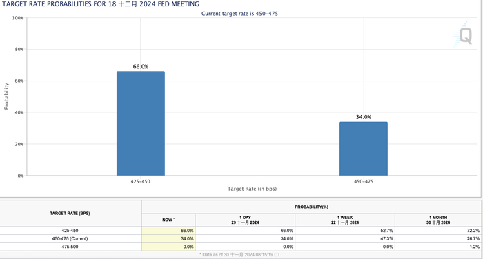据美国芝加哥商业交易所(CME)的FedWatch工具,交易员目前预计美联储12月份降息25个基点的概率为66%,维持利率不变的概率为34%。