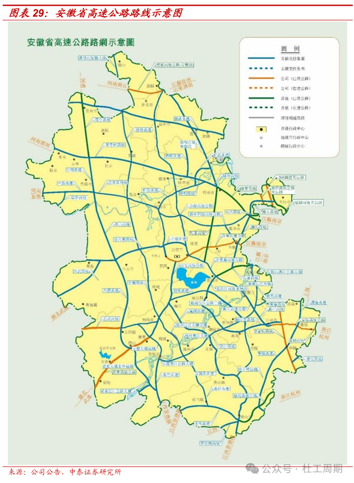 控股股东路产资源丰富,省内路产可拓展空间大。高速公路上市公司的控股股东大部分均为省属大型企业,无论在资产规模、资本实力、盈利水平和核心竞争力方面都颇具优势,多数股东与控股上市公司间具有“大集团、小公司”的特点。公司控股股东安徽交控集团在安徽省内高速公路建设和运营业务中具有很高的垄断性,且所辖路产基本为纳入国家高速公路网、安徽省 “四纵八横”主骨架、安徽省政府东向战略连接线等重点项目,路产竞争力强。截至2023年末,公司控股股东安徽交控集团全资及控股的营运路产达到75条,全部为经营性收费公路,运营总里程约5087.65公里,约占安徽省已通车里程的92%左右。同时,公司控股股东安徽交控集团已运营路产的收费年限以20-30年为主,短期内路产收费权到期压力不大。随着国家 战略的深入实施,公司所辖路段的路网经济效益有望愈加凸显,同时后续优质路产注入的空间较大。