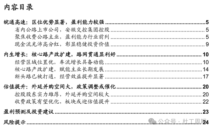 1)核心路产改扩建,赋能主业长期发展。公司核心路产合宁高速改扩建工程于2019年底完工,收费期限有所延长的同时通行能力大幅提升。另一重要路产宣广高速改扩建工程预计于2024年底完工, 改扩建期间车流量及通行费收入有所下降,参考合宁高速改扩建前后的变化,培育期过后有望迎来较大增长空间,从而增强公司长期盈利能力。2)断头路已被打通,经营效益提升显著。宁宣杭高速于2022年底全线贯通,2023年车流量实现大幅增长;2023年底宁安高速通车后对宁千、宣宁高速效益增长产生新的利好,2024年前三季度公司宁宣杭高速通行费收入(含税)同比增长约65%。2023年10月无岳高速通车, 沪武高速安徽段全线贯通对岳武高速安徽段产生利好,2024年前三季度公司岳武高速安徽段通行费收入(含税)同比增长约78%。路网结构有望持续优化,公司路产后续仍具备增长潜力。3)控股股东实力雄厚,外延并购空间较大。截至2023年末,公司控股股东安徽交控集团全资及控股的营运路产达到75条,全部为经营性收费公路,运营总里程约5087.65公里,约占安徽省已通车里程的92%左右,为公司拓展省内路产提供了丰富的资源。