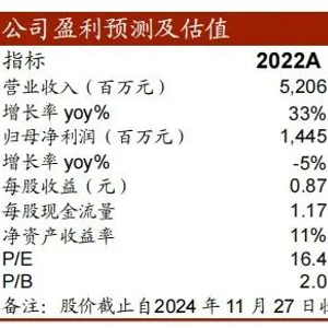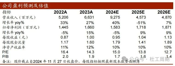 盈利预测:基于以上核心假设,我们预计公司2024-2026年实现营业收入分别为92.75、45.73、48.70亿元,同比增速分别为40%、-51%、7%, 实现归母净利润分别为15.83、17.18、18.71亿元,每股收益分别为0.95、1.04、1.13元。