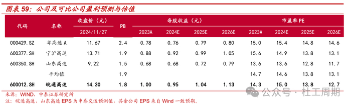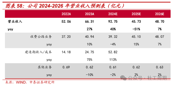 关键假设:假设2024-2026年收费公路业务营收增速分别为-4%、15%、7%;建造期收入/成本分别为52.82、0、0亿元;公司毛利率分别为26.3%、58.4%、59.5%;公司期间费用率分别为3.4%、7.8%、7.6%;2025年公司毛利率及期间费用率的变动预计主要受宣广改扩建 工程PPP项目完工后不再确认相应建造期收入/成本等因素影响。