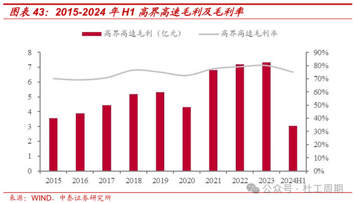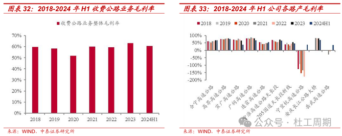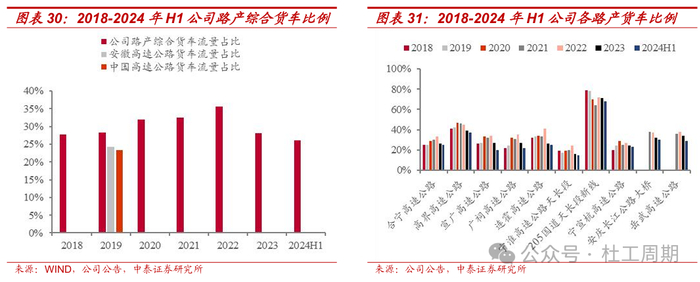 公司核心路产区位优势显著,盈利能力较强。公司拥有合宁高速公路(G40沪陕高速合宁段)、205国道天长段新线、高界高速公路(G50沪渝高速高界段)、宣广高速公路(G50沪渝高速宣广段)、广祠高速公路(G50沪渝高速广祠段)、宁淮高速公路天长段、连霍高速公路安徽段(G30连霍高速安徽段)、宁宣杭高速公路、安庆长江公路大桥和岳武高速安徽段等位于安徽省境内的收费公路全部或部分权益。截至2024年6月30日,公司拥有的营运公路里程约609公里,所属路段多为穿越安徽地区的过境国道主干线,区位优势显著。2024年H1,公司路产综合货车占比约26%,收费公路业务毛利率为60.49%,预计后续具备较强顺周期弹性。