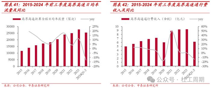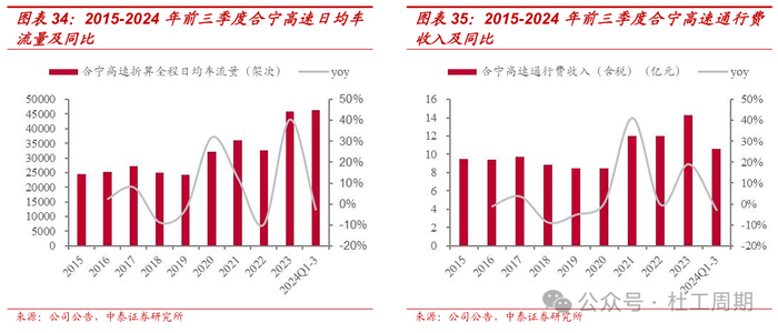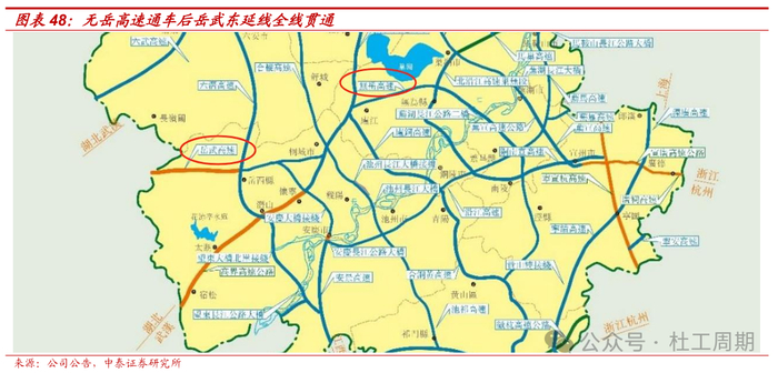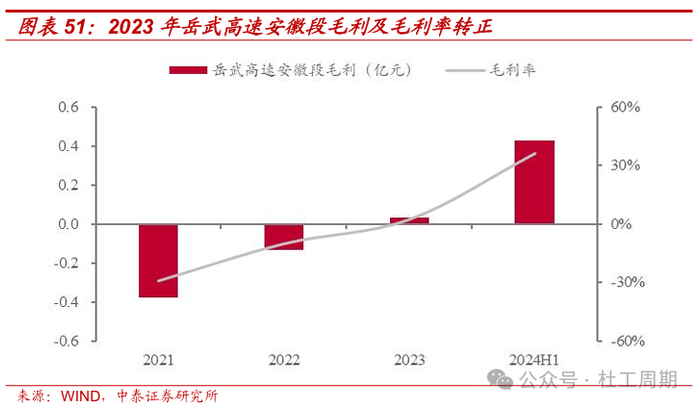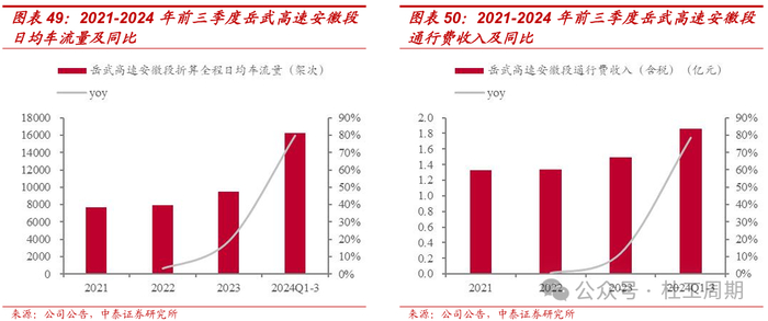 岳武东延线全线贯通,助力岳武高速安徽段经济效益提升。岳武高速安徽段是连接我国中、东部地区的一条快速通道,也是沟通安徽、湖北两省最便捷的省际区域干线之一。随着2023年10月28日无岳高速通车,岳武东延线全线贯通,往返江浙与湖北方向的车辆选择从岳武路段行驶,岳武高速安徽段11、12月份通行费同比增幅达82.39%。2023年,岳武高速安徽段折 算全程日均车流量为9455架次,同比增长约19%;通行费收入(含税)为1.50亿元,同比增长约12%;毛利率转正至2.29%。2024年前三季度,岳武高速安徽段折算全程日均车流量为16231架次,同比增长约80%;通行费收入(含税)为1.86亿元,同比增长约78%。