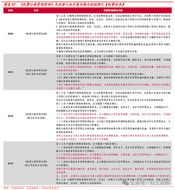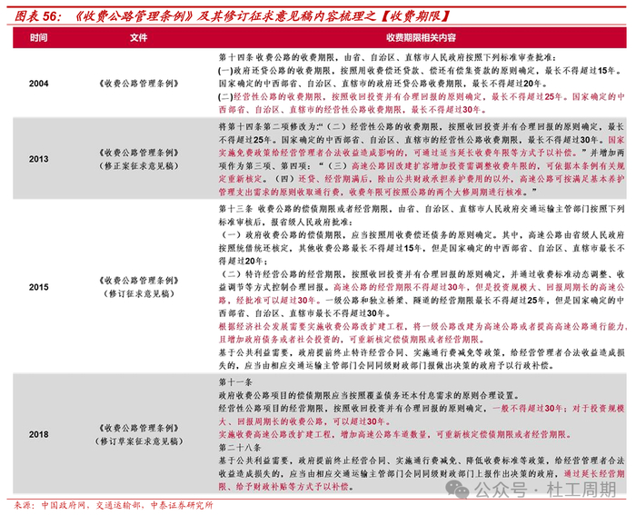 《收费公路管理条例》优化在即,收费期限等或将迎来新变化。为保障收费公路可持续发展等方面的需要,交通运输部于2018年起草了《收费公路管理条例(修订草案)》,其中对收费期限和收费标准等方面做了优化调整。2024 年5月,国务院办公厅印发《国务院2024年度立法工作计划》,《收费公路管理条例(修订)》被列为“拟制定、修订的行政法规”;同月,交通运输部印发《交通运输部2024年立法工作计划》,其中包括《收费公路管理条例(修订)》;7月,新华社授权全文播发《中共中央关于进一步全面深化改革、推进中国式现代化的决定》,其中提到“推动收费公路政策优化”,《收费公路管理条例(修订)》出台步伐有望加快。高速公路企业多数以路桥运营为主业,《收费公路管理条例(修订)》出台后,若在收费期限及收费标准等方面有所优化调整,高速公路行业或将迎来价值再发现。