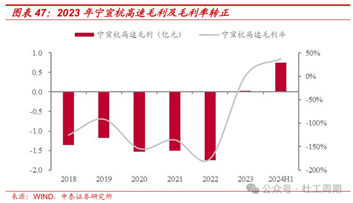 路网结构优化,宁宣杭高速盈利能力大幅改善。宁宣杭高速公路连接江苏南京、安徽宣城和浙江杭州,是长三角区域打通省际“断头路”第一批重点推进项目。公司持有的宁宣杭高速安徽段之宣城至宁国段、宁国至千秋关段、狸桥至宣城段分别于2013年9月、2015年12月、2017年12月正式通车,但仅安徽段通车导致宁宣杭高速车流量有限;2022年9月宁宣杭高速江苏段开通运营,同年12月宁宣杭高速浙江段开通运营,全线贯通后省际区域间交通更加便捷,交通量大幅增长。2023年,宁宣杭高速折算全程日均车流量为10417架次,同比增长约156%;通行费收入(含税)为2.85亿元, 同比增长约203%;毛利率转正至1.07%。2023年12月宁安高速安徽段建成通车,皖浙两省之间又一“断头路”被打通,对宁千、宣宁高速效益增长产生新的利好。2024年前三季度,宁宣杭高速折算全程日均车流量为17265架次,同比增长约70%;通行费收入(含税)为3.33亿元,同比增长约65%。随着长三角一体化战略深入实施,路网结构的优化有望带动宁宣杭高速车流量持续增长,从而进一步提升经济效益。