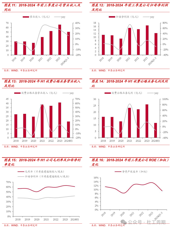 1)公司是安徽省内唯一的公路类上市公司,主营收费公路业务。截至2024年6月30日,公司拥有营运公路里程约609公里,所属路段多为穿越安徽地区的过境国道主干线,区位优势显著。2023年,不考虑建造期收入/成本,公司毛利率约为63%,归母净利率约为40%,加权平均ROE处于行业前列,路产盈利能力较强。2)公司经营性现金流充沛,并进行高比例分红回报股东。公司于2021年11月发布《关于股东回报规划(2021-2023年)的公告》,承诺未来三年(2021-2023年)现金分红比率不少于当年实现的合并报表归母净利润的60%。2023年,公司每股派发现金红利0.601元(含税),现金分红总额9.97亿元,占归母净利润的60.05%,现金分红比例处于高速公路行业上市公司前列。以公司2023年每股股利(税前)及2024年11月27日收盘价为基础,测算股息率约为4.2%。