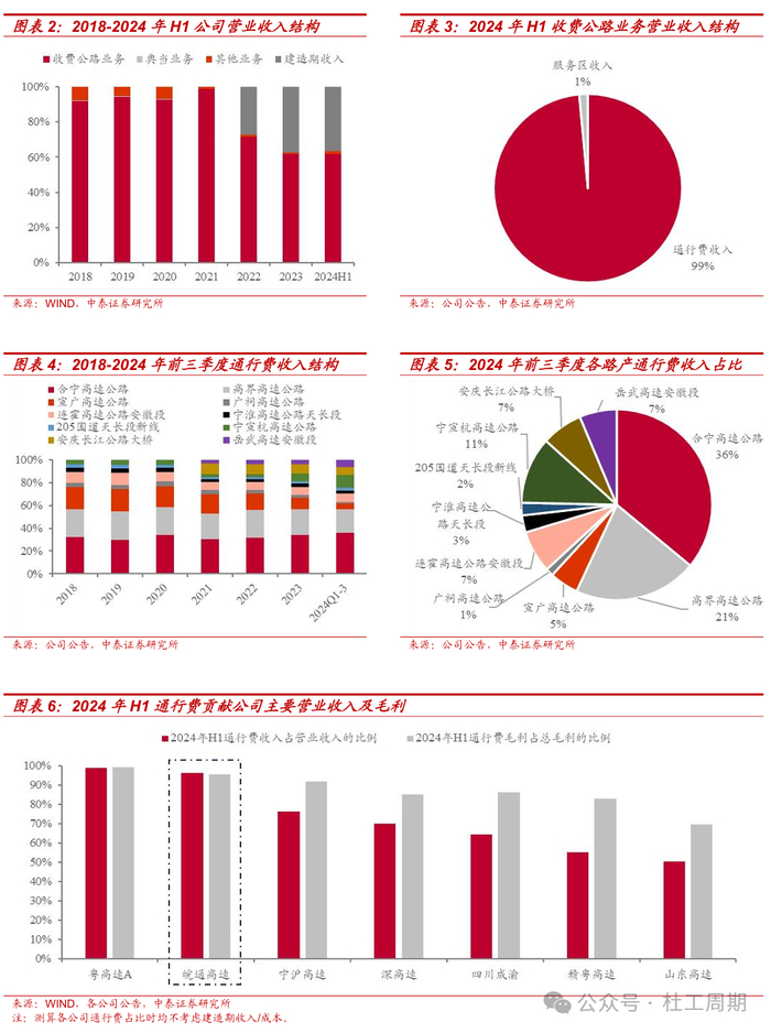 收入端:通行费收入为主。公司的主营业务为投资、建设、运营及管理安徽省境内的部分收费公路。1)优化产业结构方面,公司于2021年6月21日召开第九届董事会第九次会议,审议通过了《关于合肥皖通典当公司清算解散事项的议案》,同意皖通典当清算解散;2022年12月6日,皖通典当注销完毕,不再纳入合并范围。2)主业收购扩容方面,公司于2021年12月24日以同一控制下的企业合并方式收购控股股东安徽省交通控股集团有限公司全资子公司安徽安庆长江公路大桥有限公司100%股权和相关股东债权,大桥公司主要从事安庆长江大桥和岳武高速安徽段的收费和运营。3)具体经营模式方面,公司通过投资建设、收购或合作经营等多种方式获得经营性公路资产,为过往车辆提供通行服务,按照收费标准收取车辆通行费, 并对运营公路进行养护维修和安全维护。2024年上半年,不考虑建造期收入/成本,收费公路业务收入约占公司总营业收入的98%;而收费公路业务收入中,约99%为通行费收入,其余约1%为服务区收入。2024年前三季度,合宁高速、高界高速、宣广高速三条路产合计通行费收入(含税)占公司总通行费收入(含税)的60%以上。