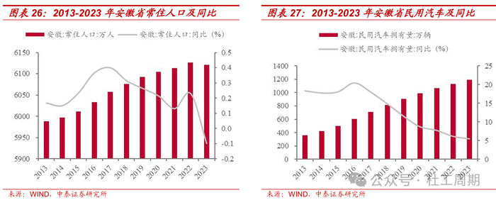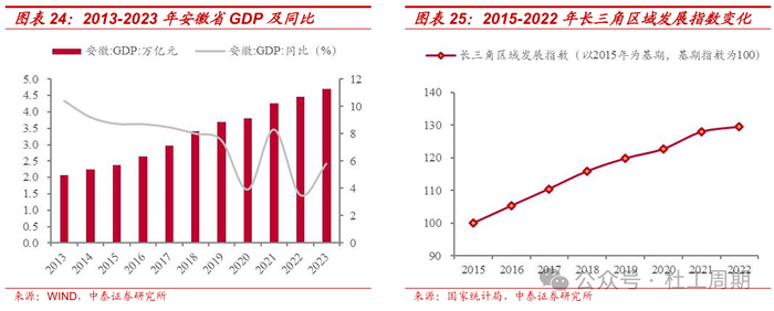 安徽积极融入长三角一体化,加快打造新兴产业聚集地。公司经营区域位于承东启西、连南接北的安徽省境内,地理位置优越,是承接沿海发达地区经济辐射和产业转移的前沿地带。2019年12月,中共中央、国务院印发 《长江三角洲区域一体化发展规划纲要》,推动形成区域协调发展新格局;2020年1月,安徽省发改委发布《安徽省实施长江三角洲区域一体化发展 规划纲要行动计划》,提到“积极承接上海非大都市核心功能疏解和苏浙产业转移,整体融入长三角产业分工协作,打造具有重要影响力的新兴产业聚集地,加快构建现代产业体系”。2013年至2023年,全省战略性新兴产业产值年均增长15%以上,占规上工业产值比重从20.7%提高到42.9%。展望后续,“长三角一体化”战略和“长江经济带”发展战略的深入实施有望催生更多的运输需求,从而为省内车流增长注入强劲动能。