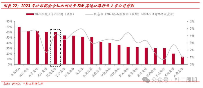 3、公司于2021年11月发布《关于股东回报规划(2021-2023年)的公告》,承诺未来三年(2021-2023年)现金分红比率不少于当年实现的合并报表归母净利润的60%。2023年,公司每股派发现金红利0.601元(含税),现金分红总额9.97亿元,占归母净利润的60.05%,现金分红比例处于高速公路行业上市公司前列。公司经营性现金流充沛,后续有望持续进行高比例分红,具备长期投资价值。