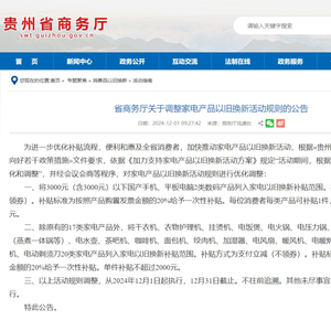 12月1日,记者从贵州省商务厅获悉,为便利和惠及更多消费者,加快推动家电产品以旧换新活动,根据《贵州省全力推动经济持续回升向好若干政策措施》文件要求,贵州省商务厅进一步调整了家电产品以旧换新活动规则。
