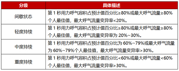 初始治疗时对哮喘严重程度的判断,对患者选择药物治疗方案十分重要。可根据白天、夜间哮喘症状出现的频率和肺功能检查结果,将慢性持续期哮喘病情严重程度分为4级(表3)。