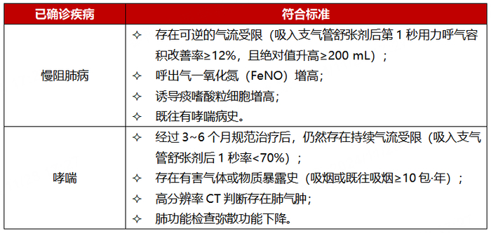 哮喘慢阻肺病重叠并非一个独立的疾病,而是哮喘和慢阻肺病两个疾病共存,但目前尚无公认的诊断标准。若此前已确诊慢阻肺病或哮喘,符合下述标准时需考虑哮喘-慢阻肺病重叠诊断(表4)。