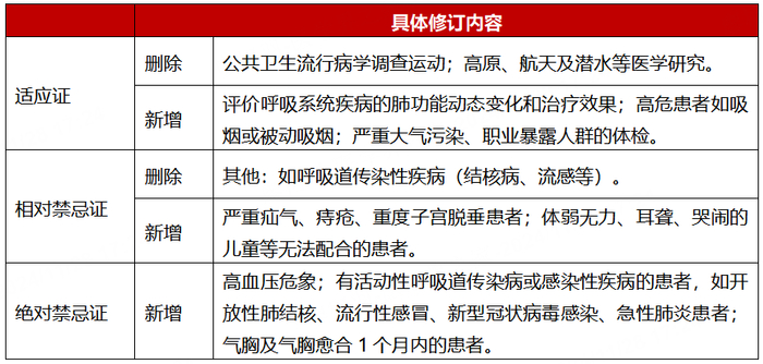 表1:新版指南中常规肺功能检查的适应证与禁忌证修订内容