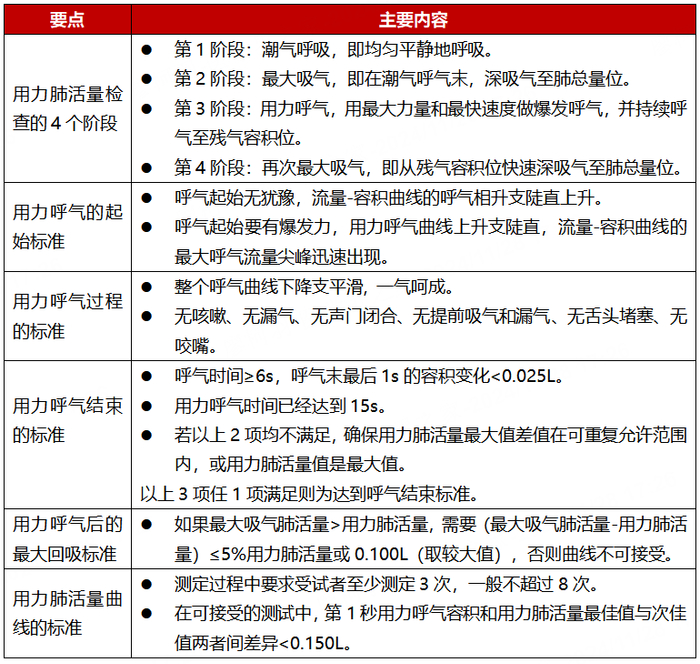 新版指南将“常规肺功能检查的操作标准和质控”章节分为了“肺功能检查前的质控”、“肺活量检查和质控”、“用力肺活量检查和质控”三部分,阐明了肺功能检查的标准操作流程与质控要求。值得一提的是,新版指南将用力肺活量的检查方法分为四个阶段,并重点提炼了相关标准(表2)。