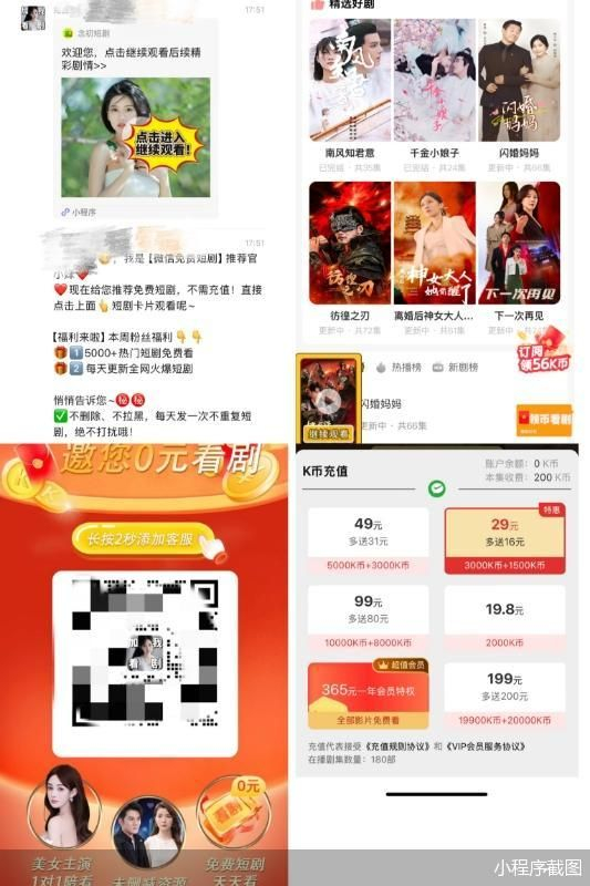 接下来,在使用该小程序的过程中,北京商报记者发现,在其侧边不断闪烁“领币看剧”的广告标语,点开后是一则“邀您0元看剧”的广告,附带某企业微信客服二维码。另外,在该广告下方还充斥着“美女主演1对1陪看”“免费短剧天天看”等诱导性广告语。