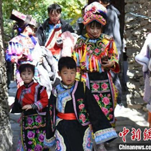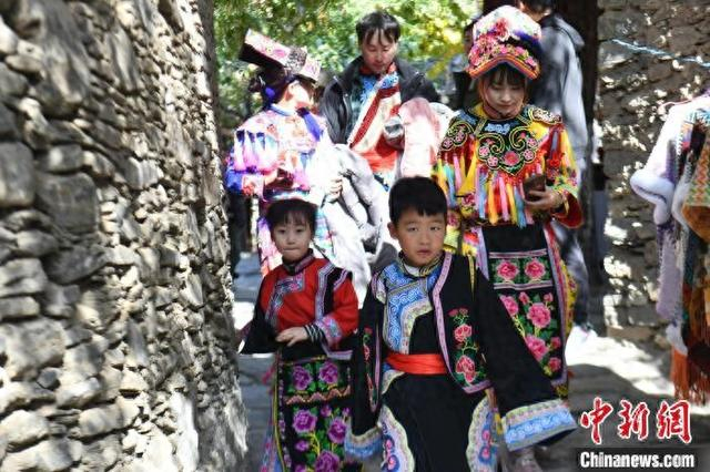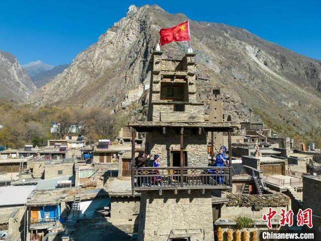 12月1日,四川理县,游客穿上羌族服饰游览桃坪羌寨。桃坪羌寨始建于公元前111年,已有2000多年的历史,是羌族建筑群落的典型代表,寨内一片黄褐色的石屋顺陡峭的山势依坡逐坡上垒,其间碉堡林立。中新社记者 张浪 摄