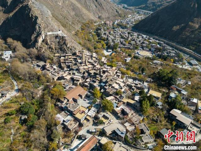 12月1日,四川理县,俯瞰桃坪羌寨。桃坪羌寨始建于公元前111年,已有2000多年的历史,是羌族建筑群落的典型代表,寨内一片黄褐色的石屋顺陡峭的山势依坡逐坡上垒,其间碉堡林立。(无人机照片)中新社记者 张浪 摄