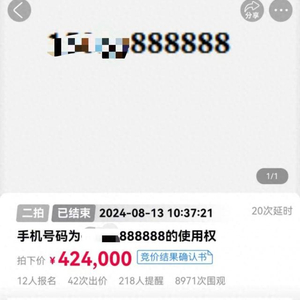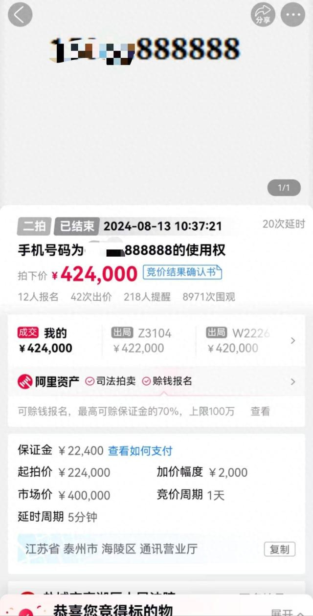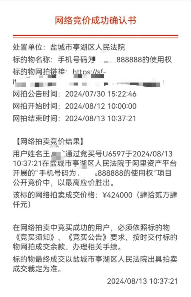 近日,江苏盐城市亭湖区人民法院在执行一起买卖合同纠纷案件中,通过网络司法拍卖程序成功处置了被执行人尾号“888888”的手机“靓号”,该手机号码使用权最终以424000元的价格成交。