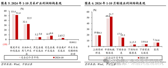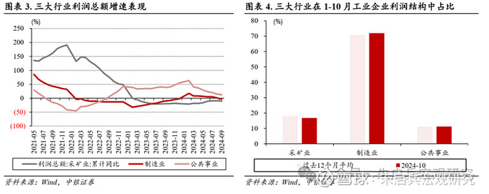 1-10月制造业利润总额同比下滑4.2%,降幅较前三季度走扩0.4个百分点,对工业企业盈利能力的支撑继续减弱。具体到子行业,2024年1-10月原材料加工业盈利延续走弱,拖累当期工业企业利润累计同比增速3.6个百分点,负贡献较前三季度继续加深0.3个百分点,而负贡献仍主要来自石油煤炭等燃料加工业、非金属矿物制品业及黑色金属加工业,分别拖累1-10月工业企业利润总额累计同比增速1.4、2.0和0.8个百分点。