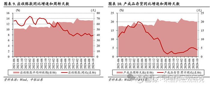 应收账款平均回收期有所延长。2024年1-10月,工业企业应收账款同比增长7.8%,增幅较前三季度走扩0.2个百分点;应收账款平均回收期为66.7天,较前三季度延长0.4天。2024年1-10月产成品存货累计同比增长3.9%,增速较前三季度下滑0.7个百分点;工业企业产成品周转天数为20.0天,与前三季度持平。