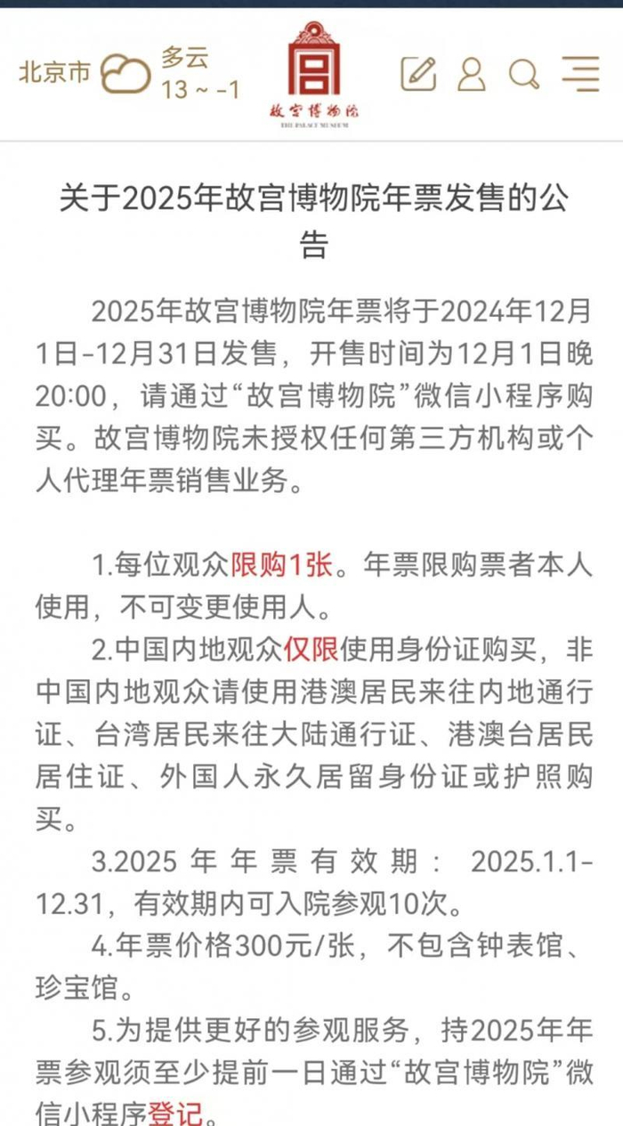 2025年故宫博物院年票于2024年12月1日-12月31日发售,开售时间为12月1日晚20:00,可通过“故宫博物院”微信小程序购买。故宫博物院未授权任何第三方机构或个人代理年票销售业务。