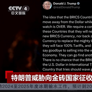 据央视新闻,当地时间11月30日,美国当选总统特朗普在其创建的社交媒体平台上发文,要求“金砖国家”放弃创造新货币或支持其他货币取代美元的计划,否则这些国家将面临100%的关税。