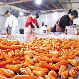 “今年收成不错,和往年几毛钱一斤的批发价相比,今年胡萝卜的批发价高了不少,每斤都超过了1块钱。”韩伯成说,他们每天至少加工100吨胡萝卜,通过冷链物流运往全国各地,还有一部分出口到国外。