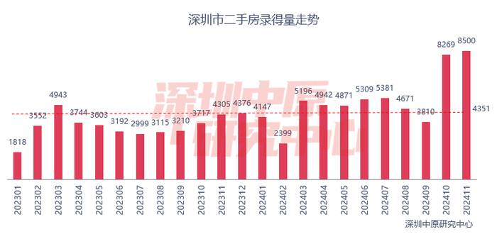 11月深圳二手成交维持“繁荣线”水平。据深圳中原研究中心统计,11月,深圳二手房录得量达到8500套,为近46个月来最高。