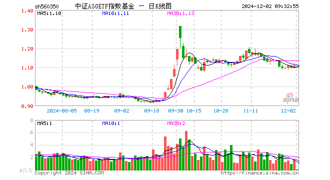 12月2日,中证A50ETF指数基金(560350)开盘跌0.18%,报1.107元。中证A50ETF指数基金(560350)重仓股方面,贵州茅台开盘涨0.02%,宁德时代跌1.00%,中国平安跌0.09%,招商银行涨0.30%,美的集团涨0.03%,长江电力涨0.26%,紫金矿业涨0.13%,比亚迪涨0.65%,中信证券跌0.49%,恒瑞医药跌0.18%。