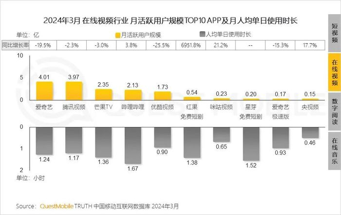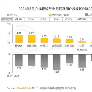 事情是从今年3月开始转变的。根据第三方机构QuestMobile发布的数据,2024年3月,红果短剧以5400万的月活跃用户数位列在线视频行业第六,但其月人均单日使用时长达约1.38h,超过爱奇艺、优酷、腾讯视频、芒果TV等四大长视频平台。
