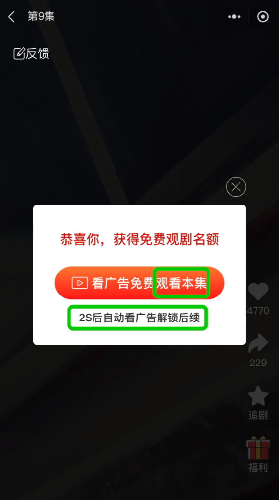 与投流不同,红果短剧的盈利模式依赖于广告,这种模式被称之为IAA(In-App Advertisement),即用户免费观看短剧,片方通过中插广告等方式获取收益,这意味着用户在观看一定时长后会看到广告,例如每看3集短剧可能会看到8秒钟的广告。