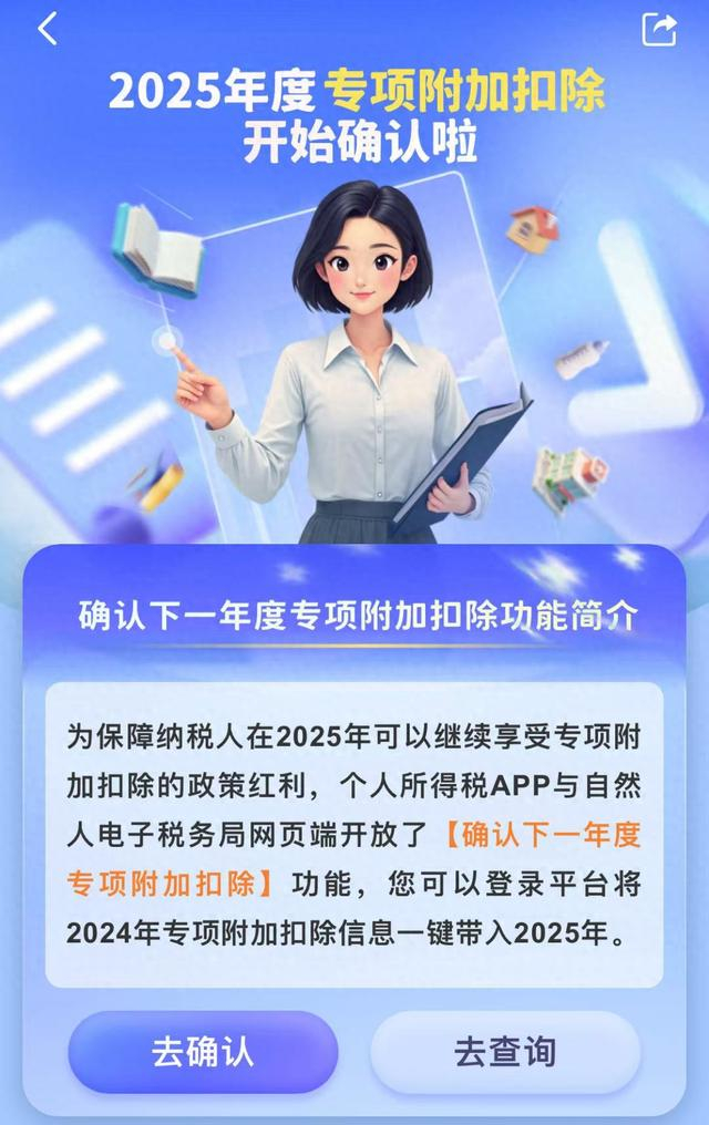 对于2025年申报个税专项附加扣除信息与2024年完全一致的纳税人,个税APP上有“确认下一年度专项附加扣除一键带入功能”,点击进去即可快捷确认2025年个税专项附加扣除相关信息。