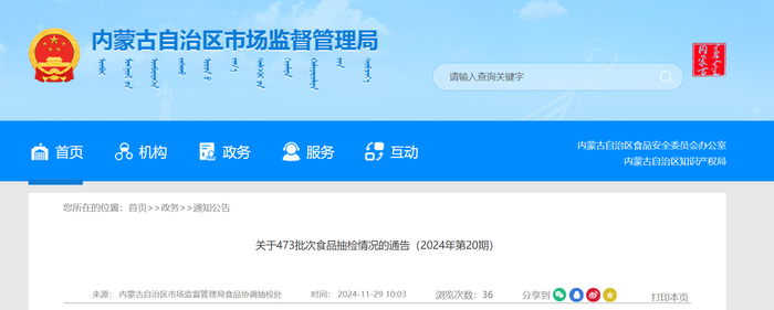 内蒙古自治区市场监督管理局关于473批次食品抽检情况的通告(2024年第20期)